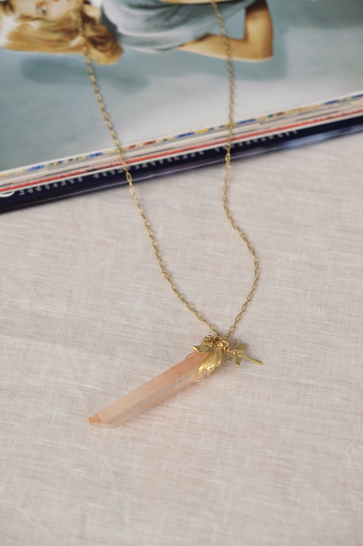Collana con catena in acciaio inossidabile dorato, arricchita da un ciondolo con pietra naturale di Cristallo di Rocca, accompagnata da una delicata libellula in bronzo e una piccola pigna, simboli di leggerezza e natura.