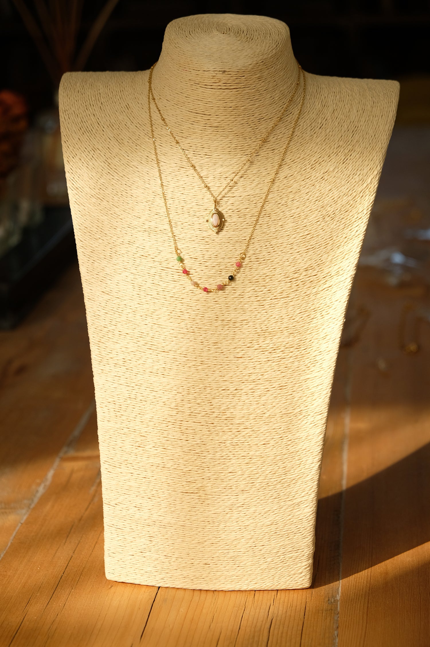 Collana in acciaio inossidabile dorato, impreziosita da una pietra naturale incastonata in un medaglione e arricchita da un filo di pietre colorate con due varianti di altezza, 21 cm e 25 cm.