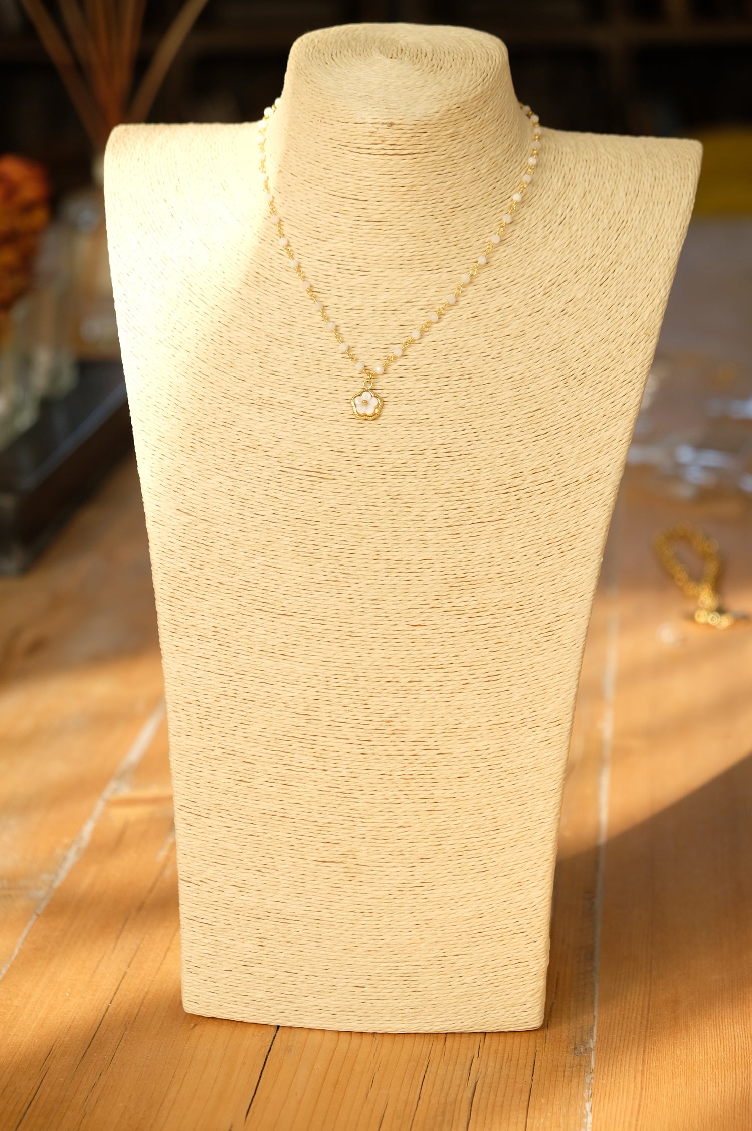Collana in acciaio inossidabile dorato, arricchita da un delicato ciondolo a forma di fiore in madreperla e pietre naturale di luna, che donano un tocco di luminosità .