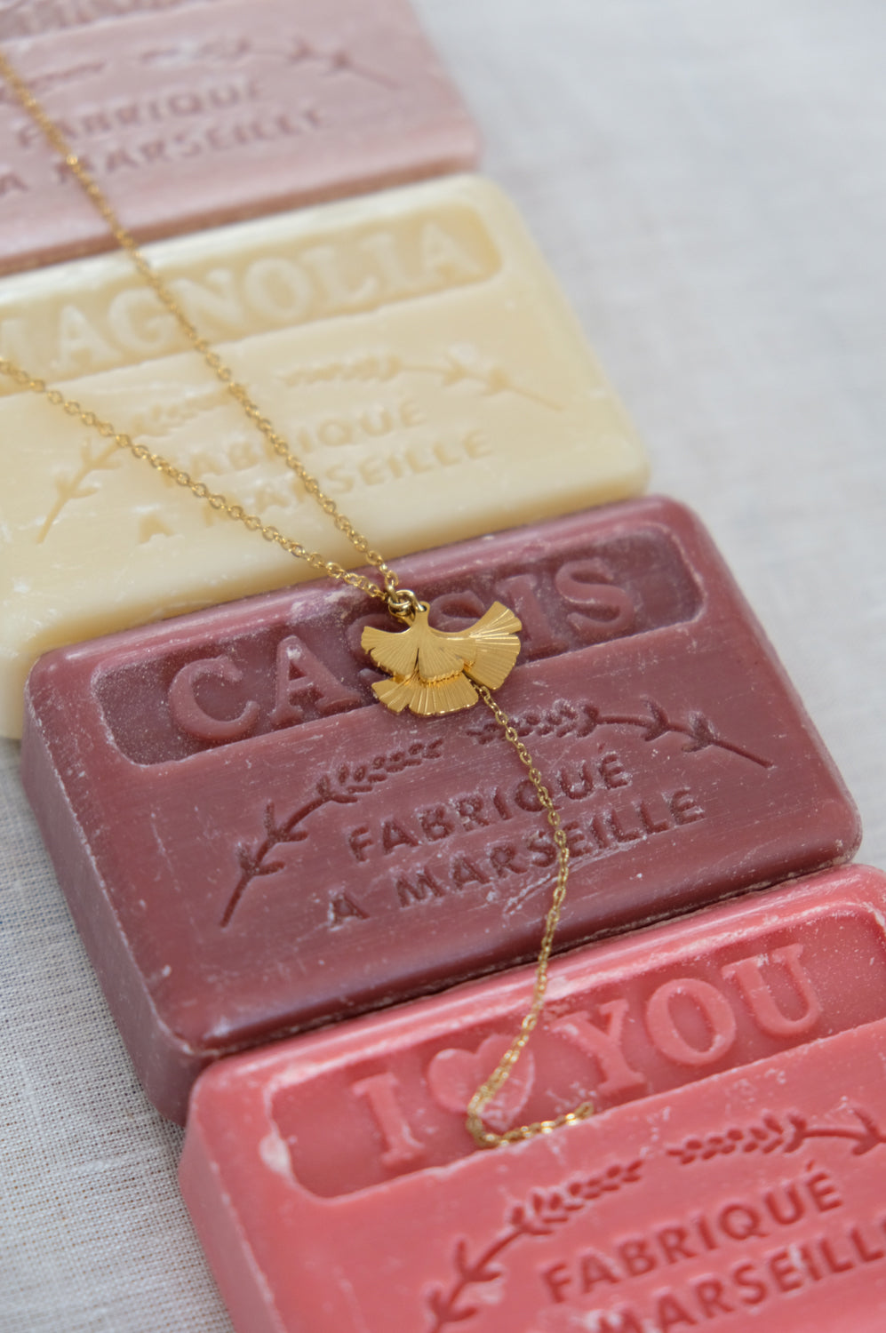 Collana con catena in acciaio inossidabile dorata, impreziosita da pendenti a forma di foglia di ginkgo.
