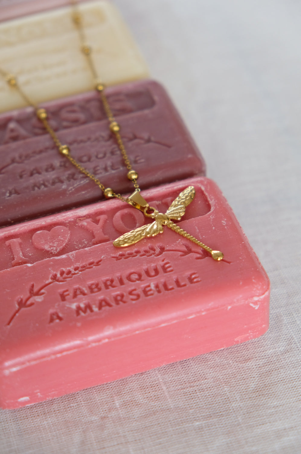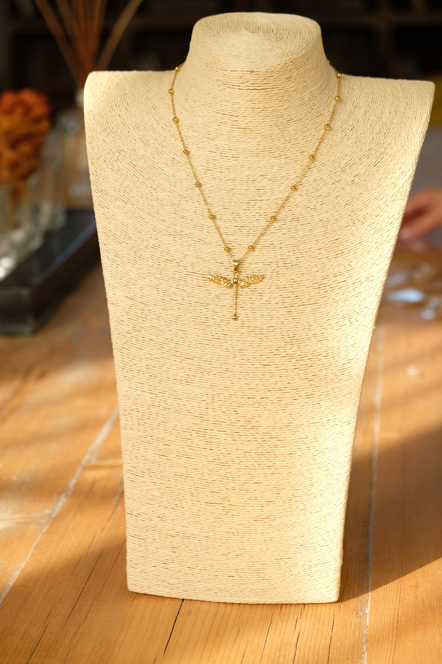 Collana in acciaio inossidabile dorata, con un delicato pendente a forma di libellula che misura circa 3,5 x 3 cm.