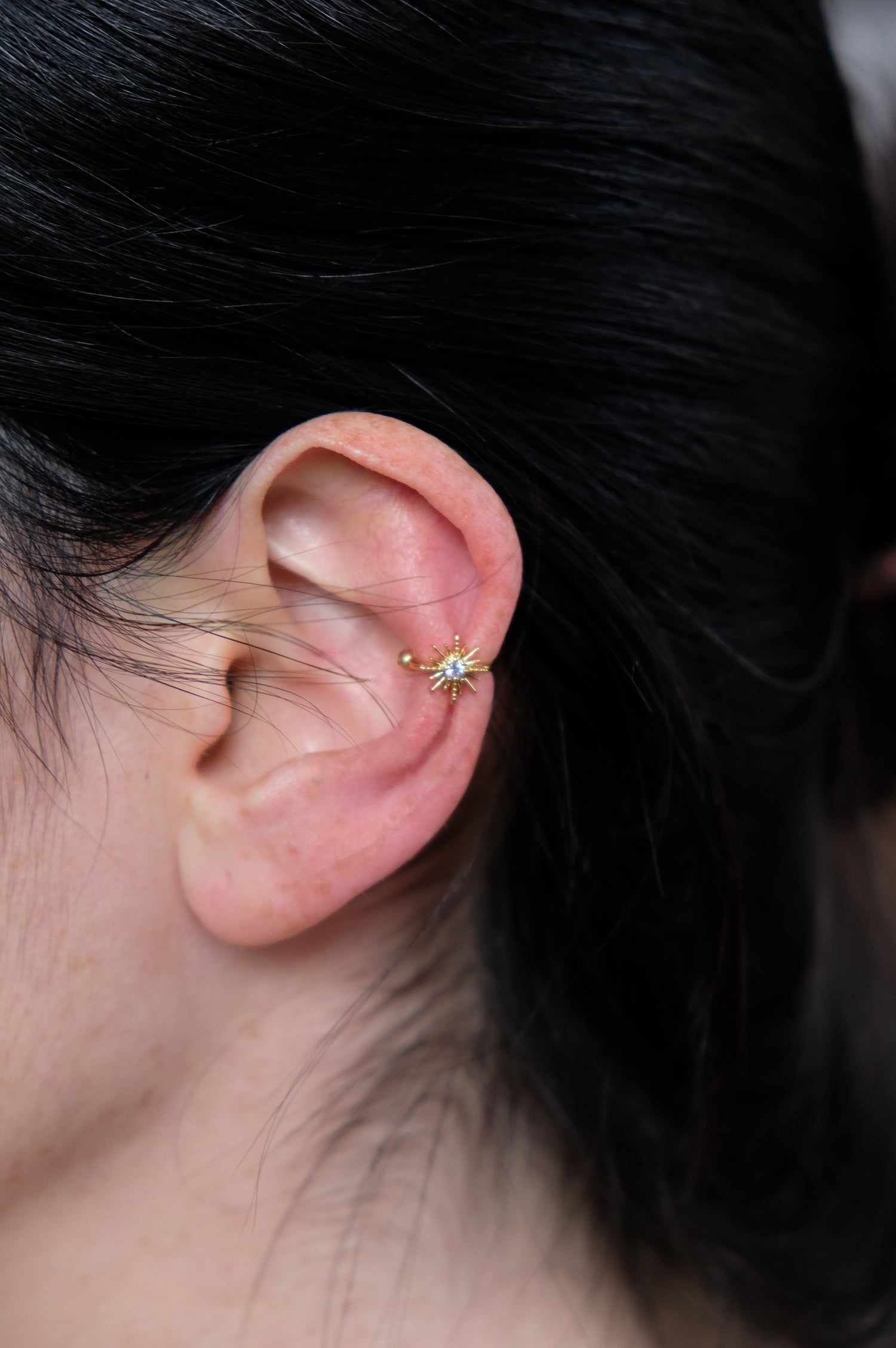 Ear cuff che incarna l'essenza della semplicità sofisticata, realizzato in acciaio inossidabile dorato. La sua struttura, caratterizzata da un un sole centrale, avvolge delicatamente l'orecchio, creando un effetto visivo pulito e contemporaneo. Con una dimensione di circa 7 mm, offre il giusto equilibrio tra visibilità e discrezione.
