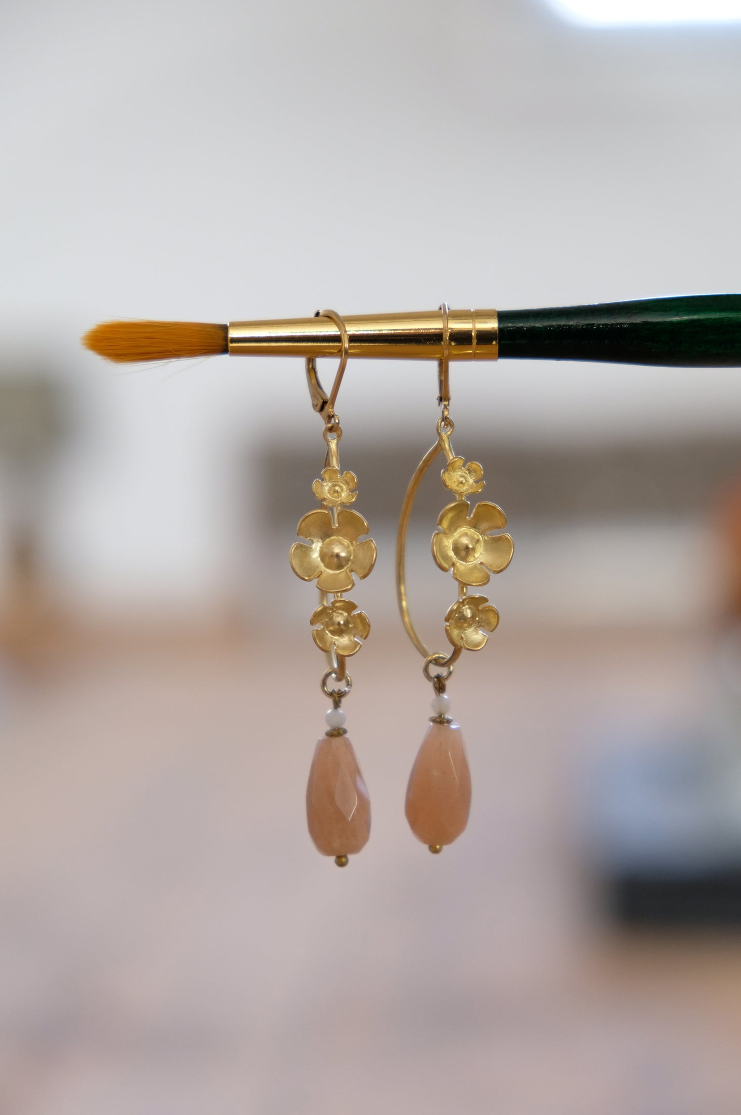 Orecchini pendenti dal design floreale realizzati in bronzo grezzo, su cui è incastonata una pietra naturale solare, per un effetto naturale e ricercato.