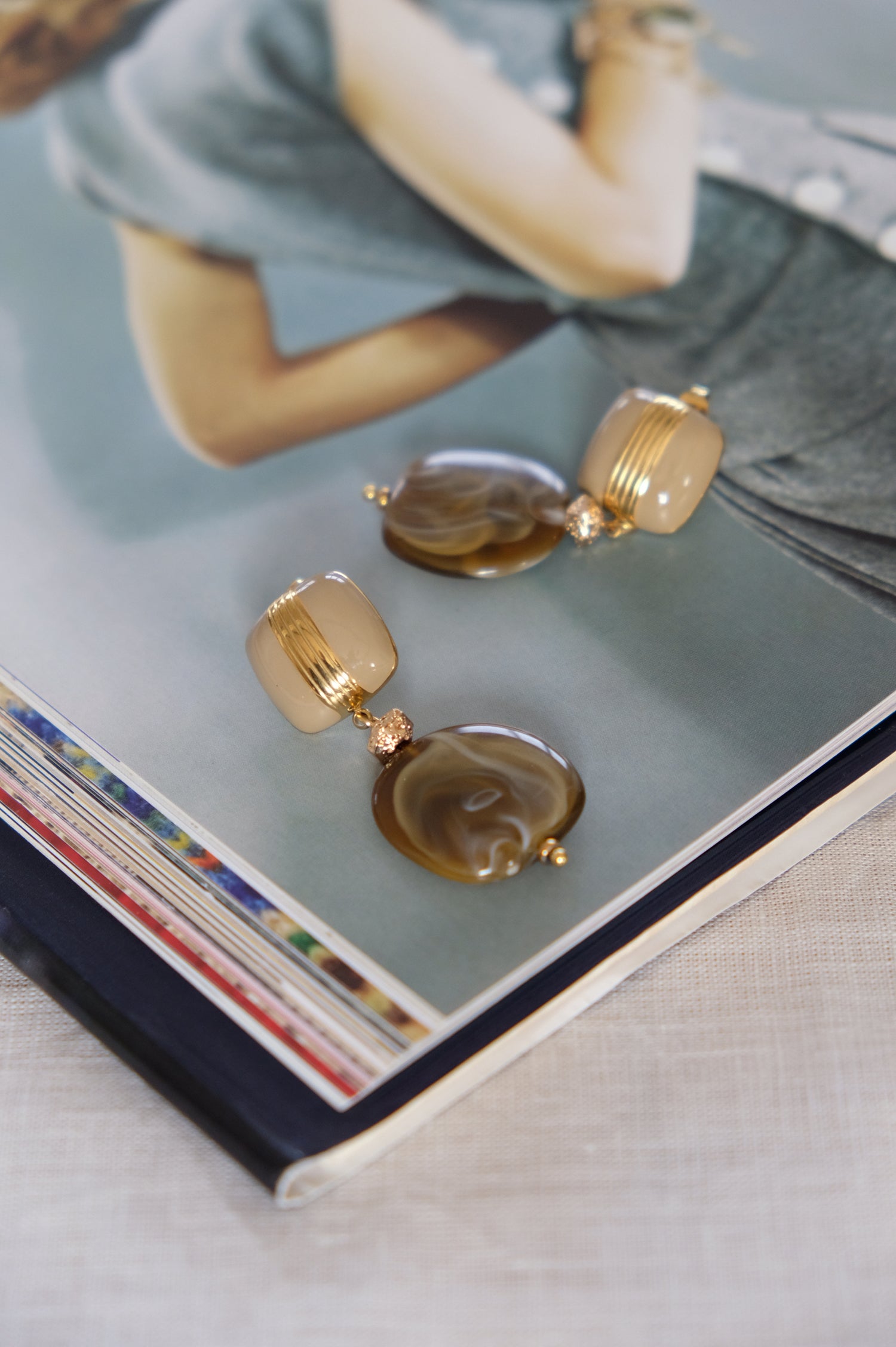 Orecchini in acciaio inossidabile dorato dal design elegante e moderno, impreziosito da pietre in resina color beige che donano un tocco delicato e sofisticato.