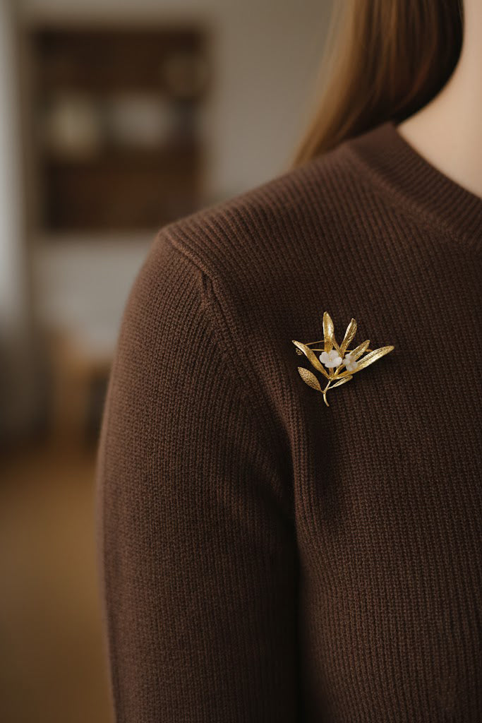Spilla a forma di Fiore con Perle d’Acqua Dolce in ottone dorato, dal design raffinato e delicato.