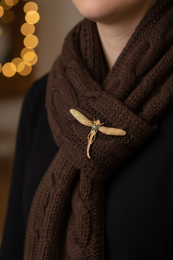 Spilla a forma di Libellula in bronzo grezzo impreziosita da una pietra di Agata Verde naturale, mette in risalto l’arte artigianale e il fascino della natura.