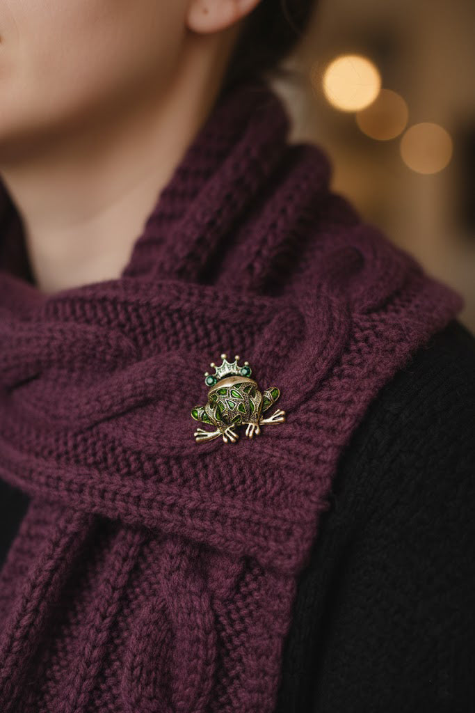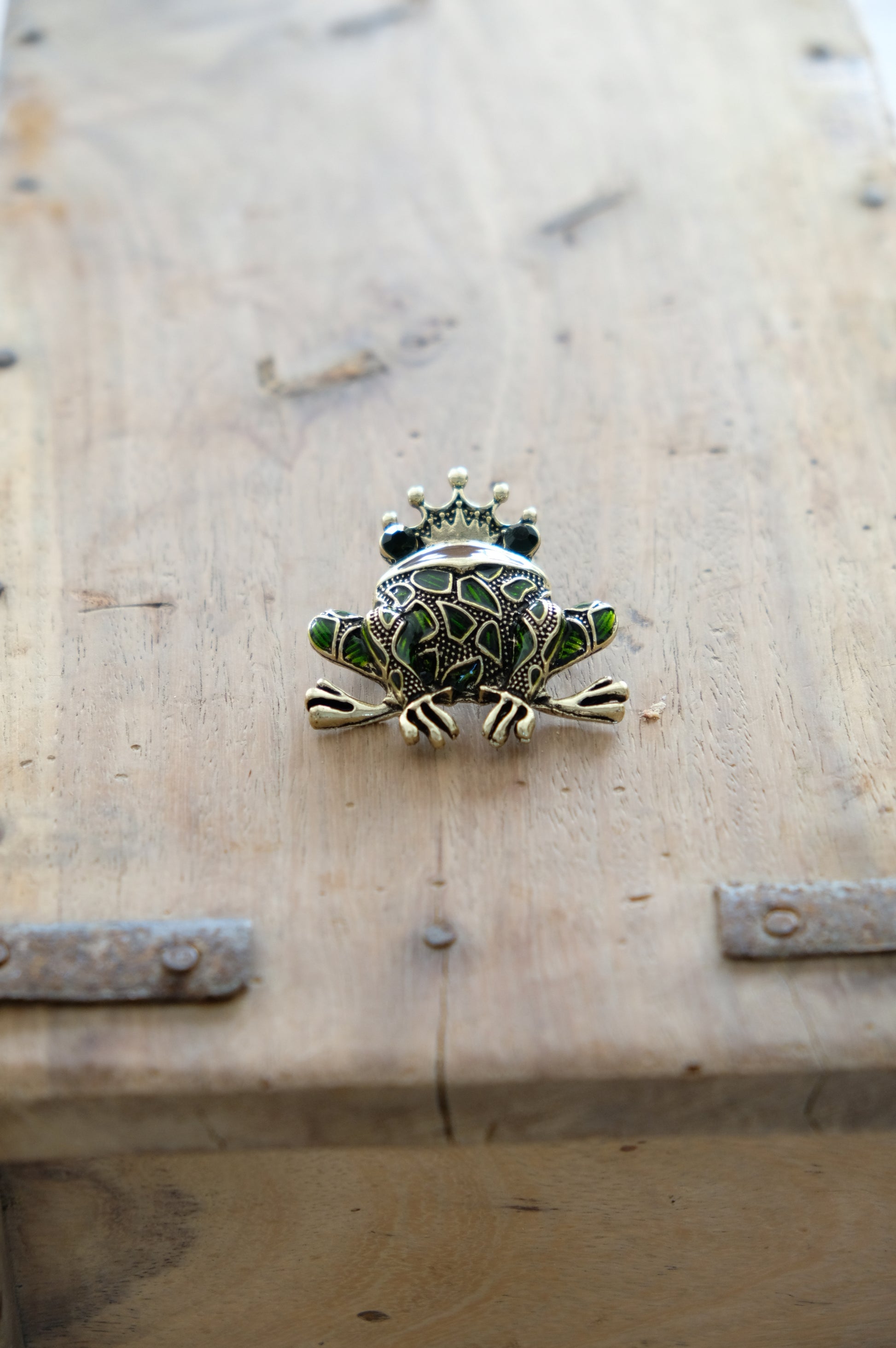 Spilla a forma di ranocchio in ottone dorato, dal design giocoso e raffinato.